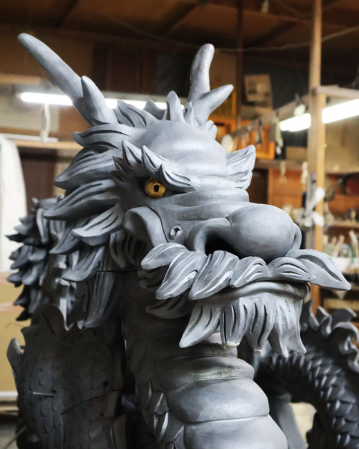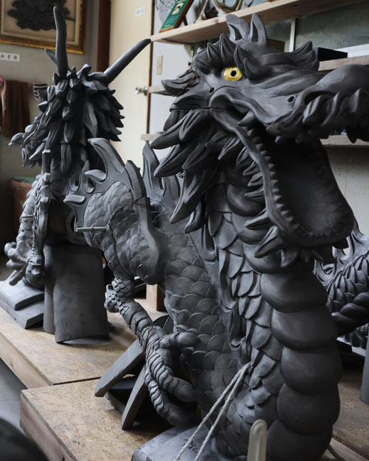 一体が3m級のものになるので、台風や地震対策の為、いったん既存の瓦を剥いで、龍の瓦と柱を鉄柱でつなぎボルトで固定します。 思った以上に時間がかかるようで、年内中の完成を目指しています。