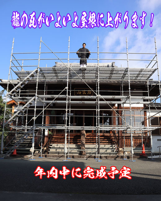 「龍の瓦を屋根に!工事開始」 龍でつなぐプロジェクト 瓦の部 廣現寺本堂正面に足場が組まれ、いよいよ工事が始まりました。 念願の龍の瓦が四体取り付けられ、今までとは一味違う外観になるはず!